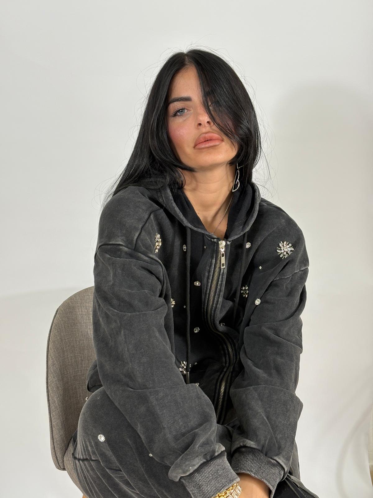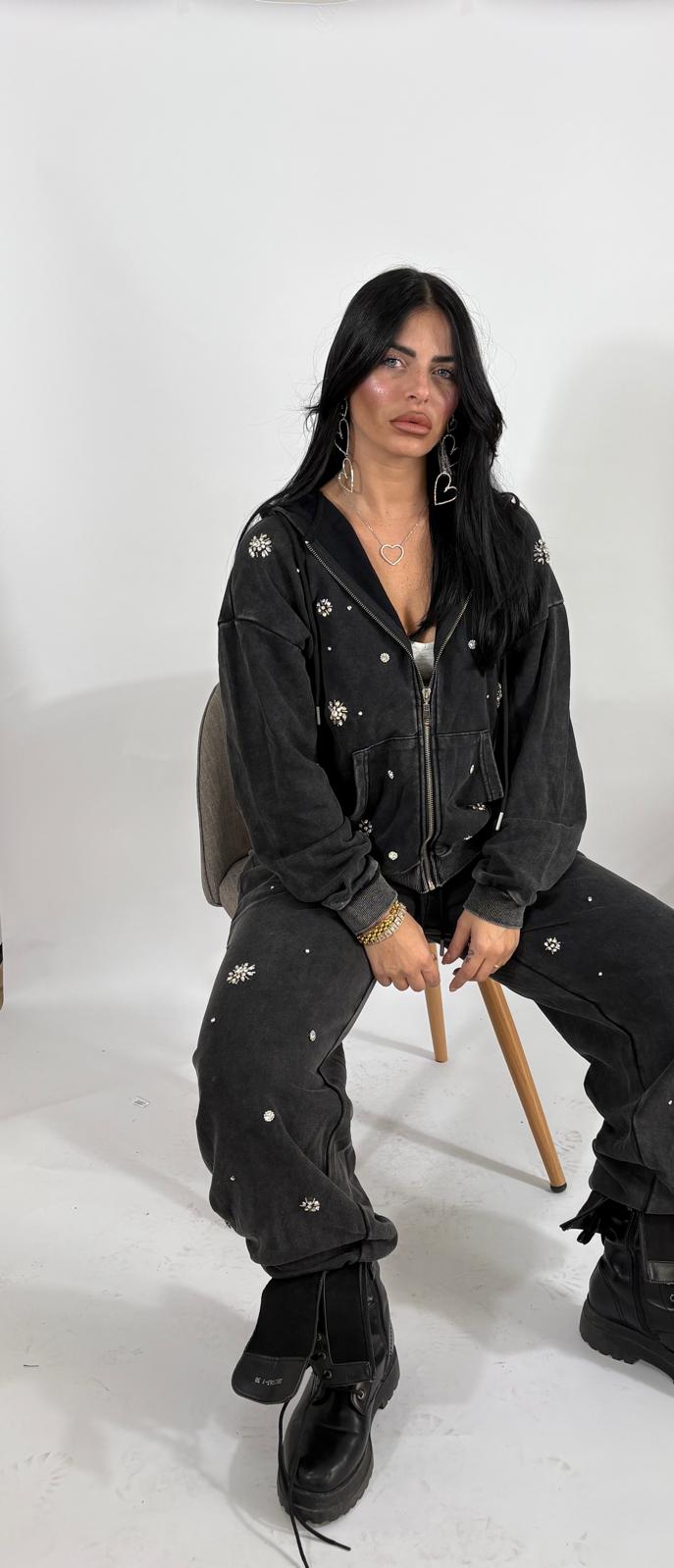 coordinato con strass presenta felpa con zip e pantalone con elastico in vita. Veste fino ad una 46.