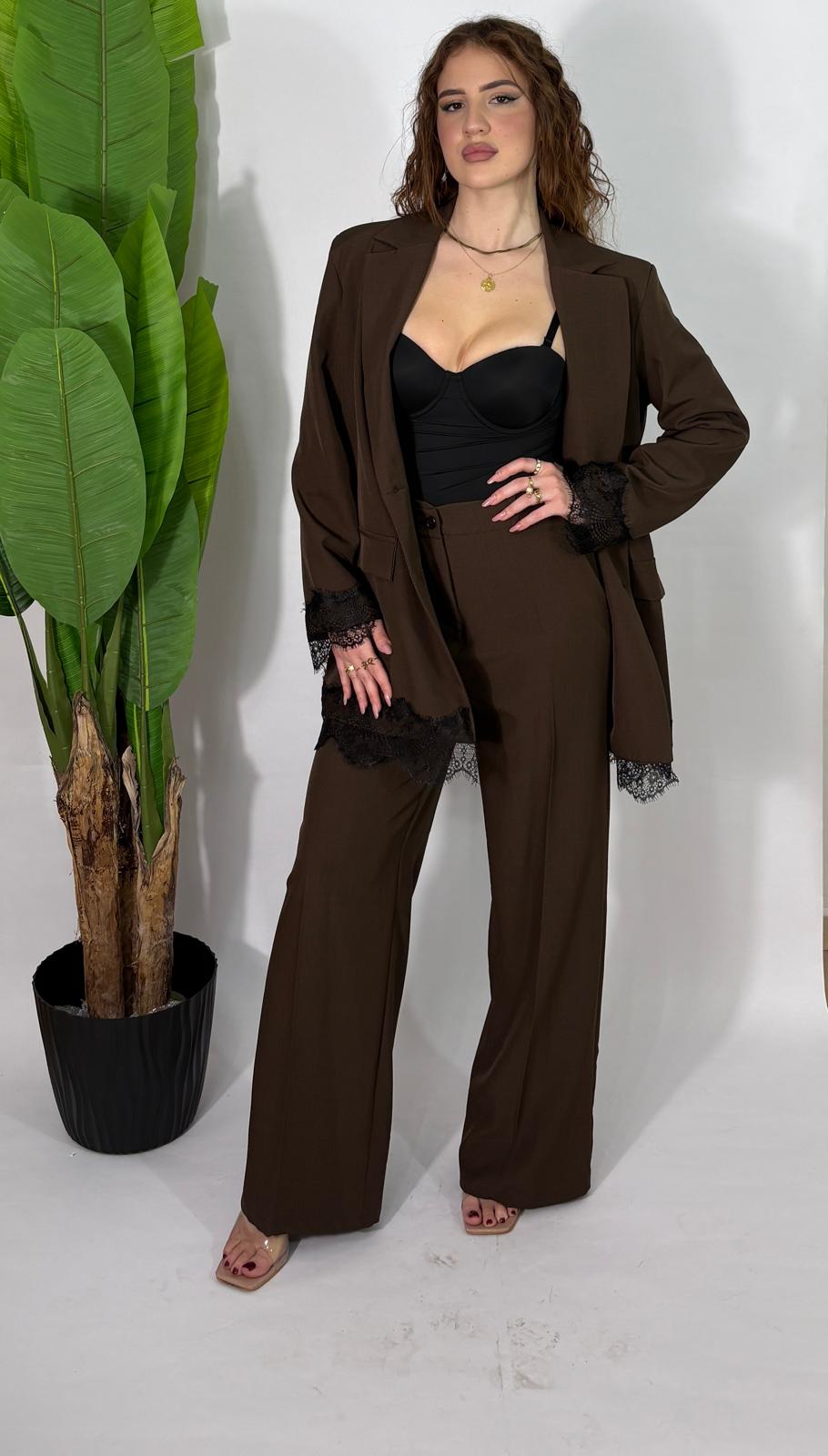 tailleur con pantalone vita alta con elastico sul retro.Veste fino ad una 46.